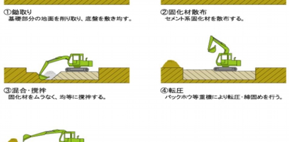 表層改良工法は、セメント系固化材(無機質系、無公害)を軟弱地盤に散布して、現地盤の土と混合・撹拌・転圧を行い版状の固結体を作る工法です。